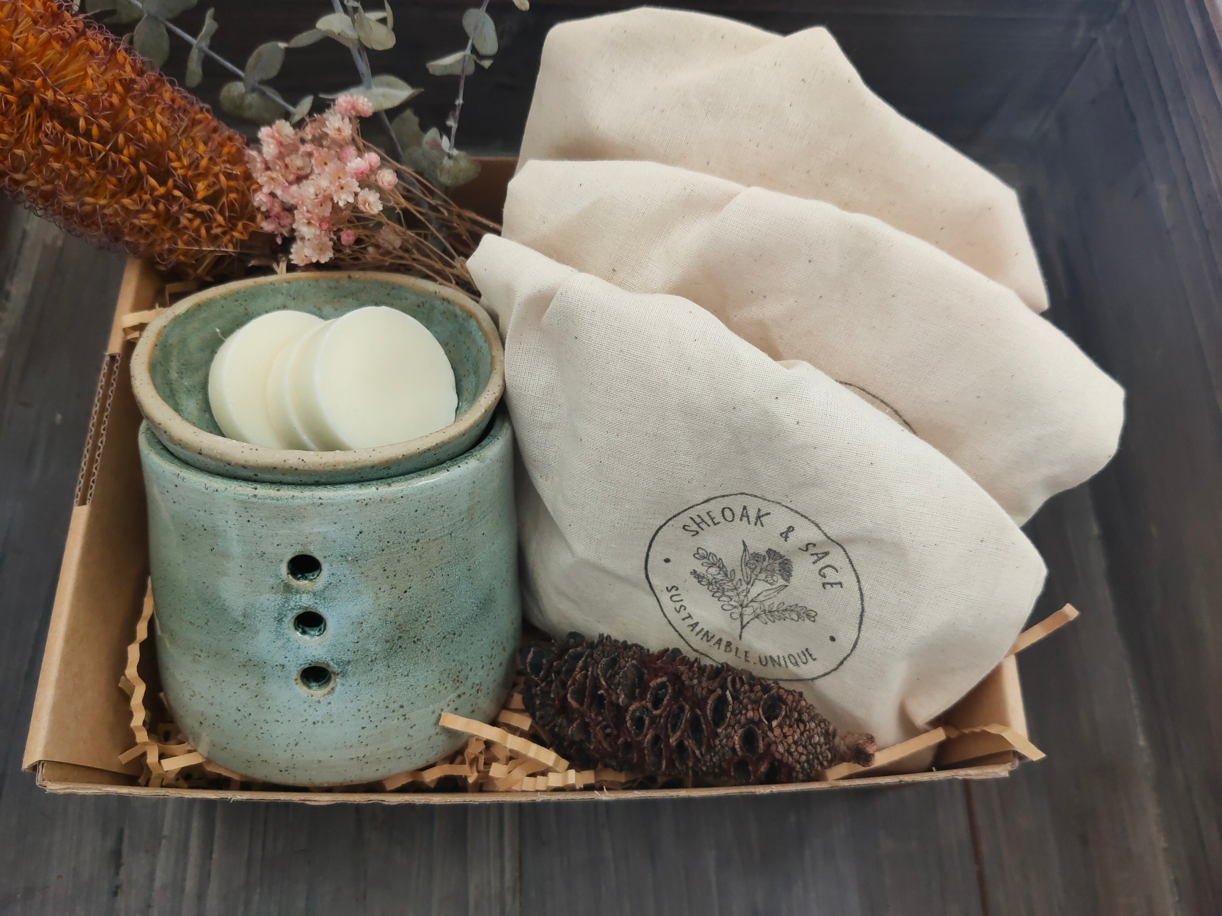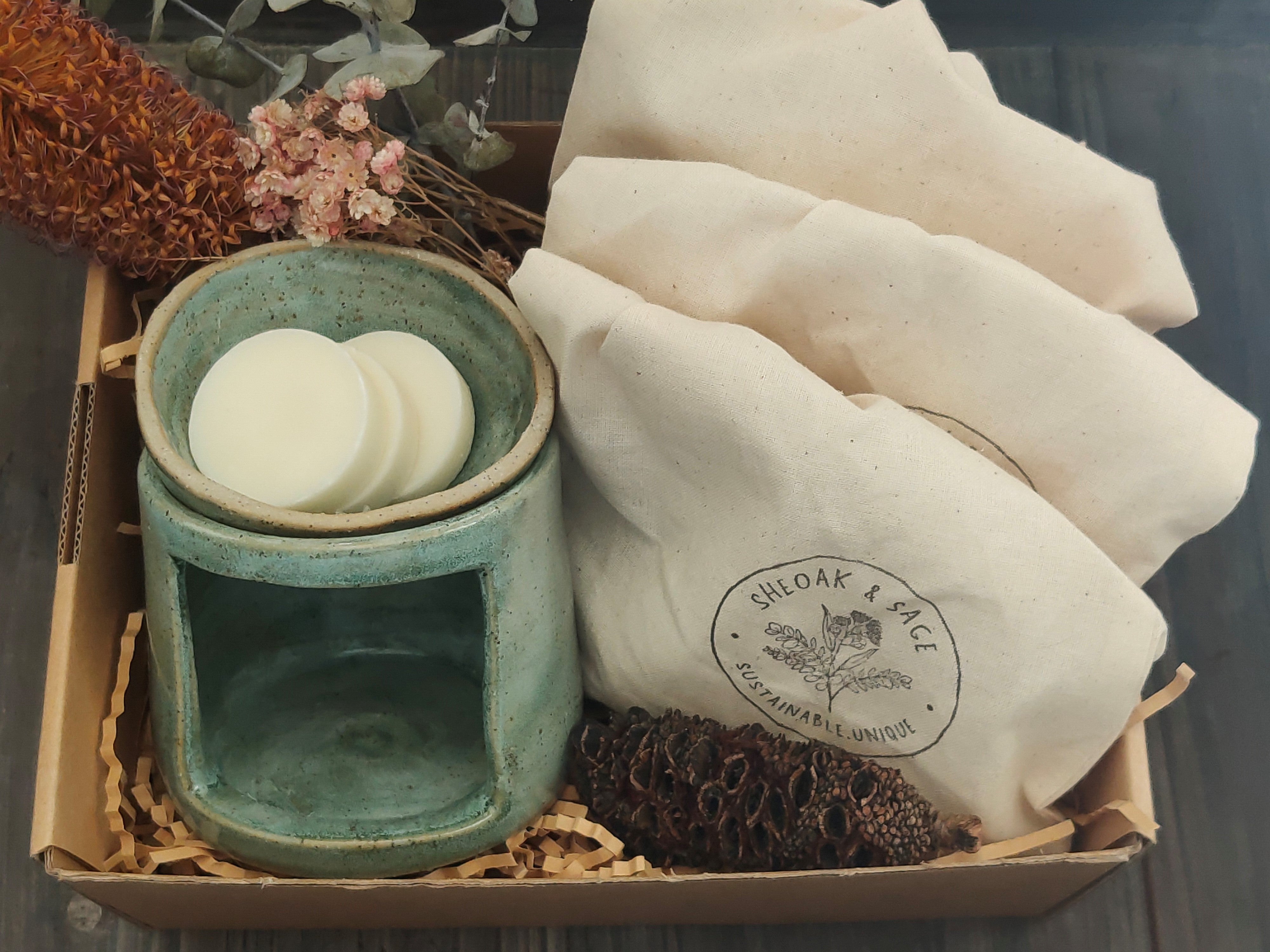 Hand thrown in Melbourne by Sarah Louise ceramics, each one unique; accompanied by our signature bush melts + tealight candles. A perfect gift for yourself or someone special.